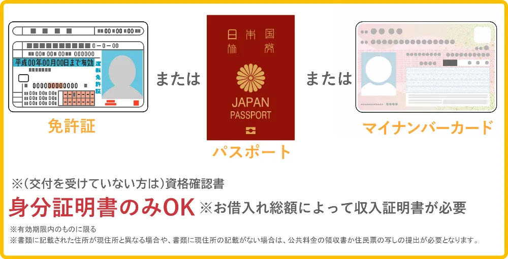 | 必要書類 | ① 免許証のみ ② パスポートのみ ③ 保険証+1点※2 | ||