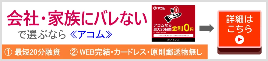 | <バレない対応> 〇 WEB完結、原則郵送物無し、カードレス全て対応 〇 WEB申し込み後、電話の在籍確認なし 〇 50万円以下なら収入証明書が不要 |